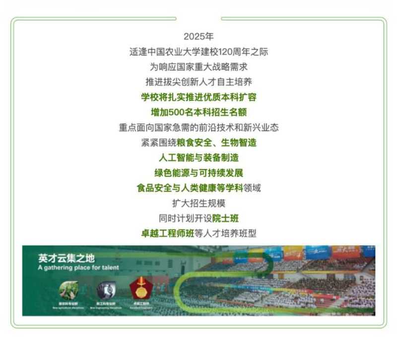 中国农业大学将扩招500名本科生,重点围绕粮食安全、生物智造等领域,扩大招生规模,并计划开设院士班、卓越工程师班等。
