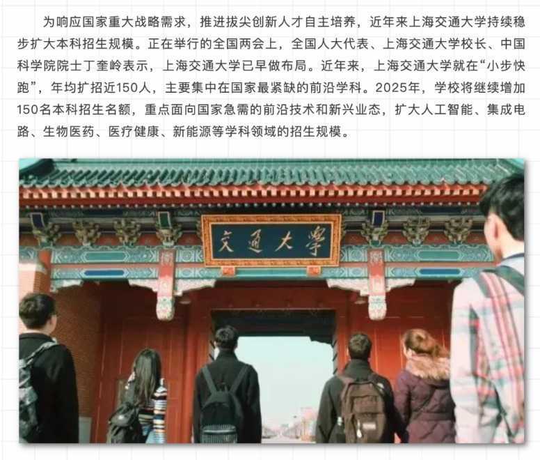 上海交通大学今年将扩招150名本科生,主要面向人工智能、集成电路等前沿学科,旨在更好地服务国家战略需求。