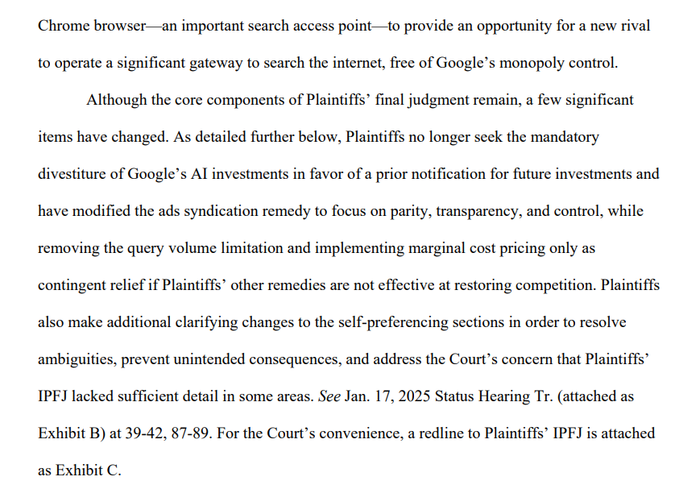 根据法庭文件,美国政府调整了对谷歌的整改措施,不再强制要求剥离其人工智能投资,但要求谷歌在未来进行投资时提前通知。同时,美国政府依然坚持要求谷歌剥离Chrome浏览器业务,旨在“为新的竞争对手提供发展空间”,这一决定无疑将对谷歌的业务布局产生深远影响。