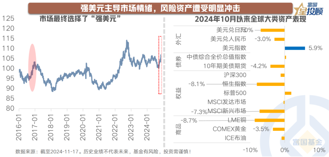 自9月末以来,美元跃居资产配置的首要考量,市场提前感知到“特朗普胜选”的可能性。随着大选尘埃落定,美元指数一举突破107的关键点位,10年期美国国债收益率亦攀升至4.5%的高位,黄金、原油、铜等大宗商品遭遇剧烈回调,美股亦步入调整阶段。