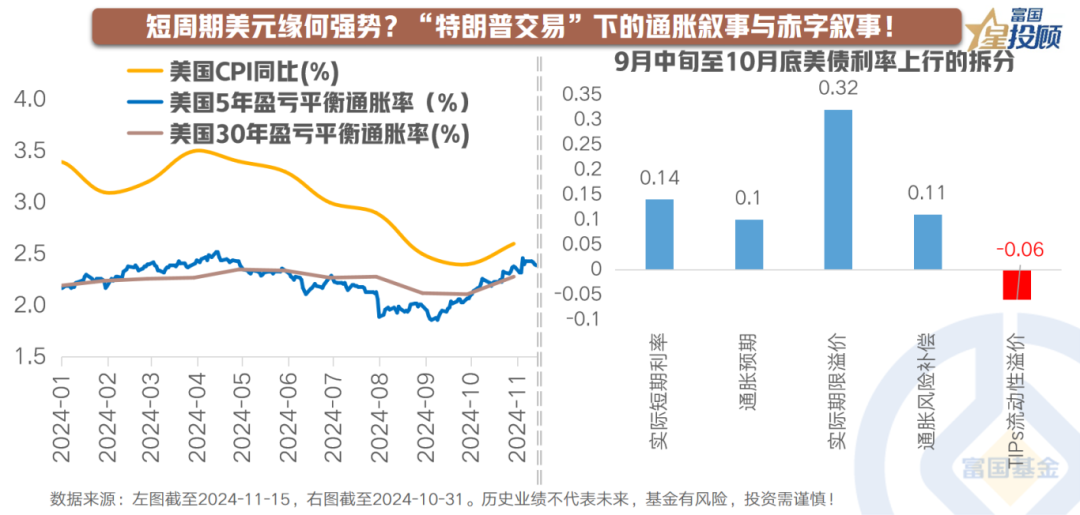 资本市场担忧潜在关税上调将加剧通胀,推动美元指数和美国国债收益率飙升,接近今年降息预期启动前的水平。然而,通胀预期和通胀风险对美债收益率上行的推动作用,并不及实际期限溢价的影响,而实际期限溢价主要受美债供需关系左右。