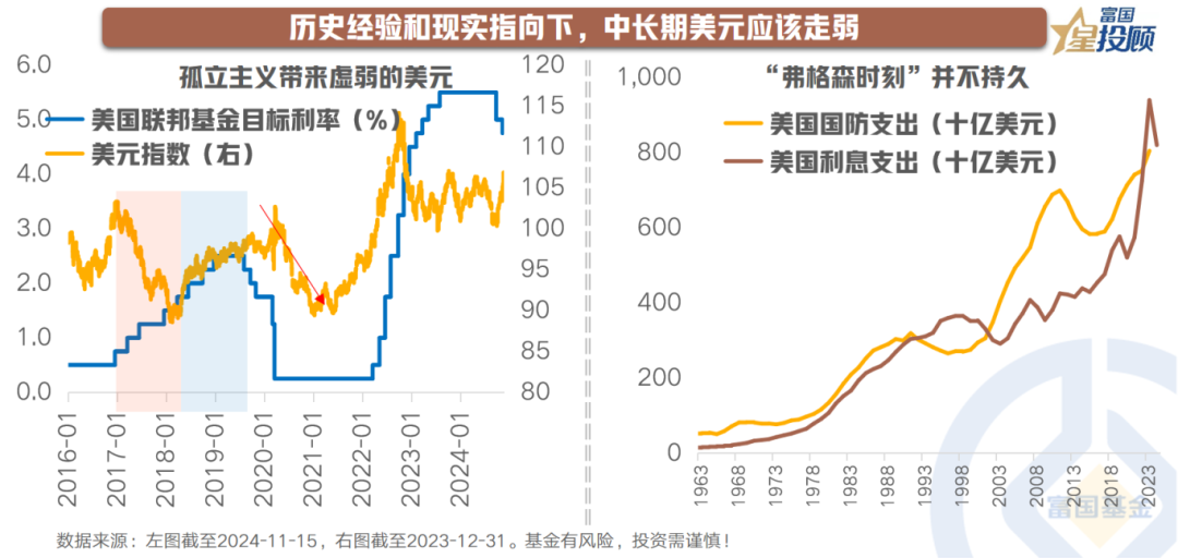 此外,2024财年,美国历史上首次出现债务付息支出超过国防军费开支的现象,为“弱美元”提供了有力支撑。