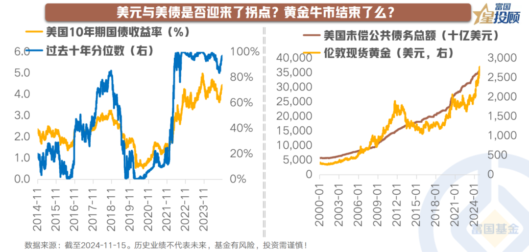 然而,当前特朗普交易仍有进一步上涨和演绎的空间,市场或需耐心等待;同时,美债和美元冲高后,或将提供反向交易的机会。黄金因过度计入预期而近期调整明显,或将逐渐回归“去美元化”的基本逻辑。