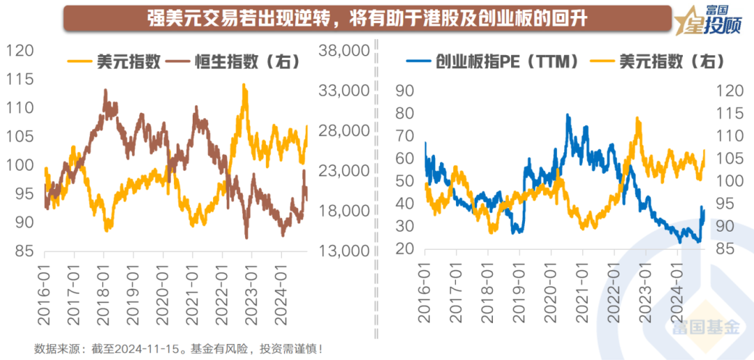 鉴于特朗普政策节奏及力度的不确定性,短期利率上行空间有限,美元指数可能转为震荡,为港股带来布局机会。同时,创业板估值的压制也将进一步减轻。