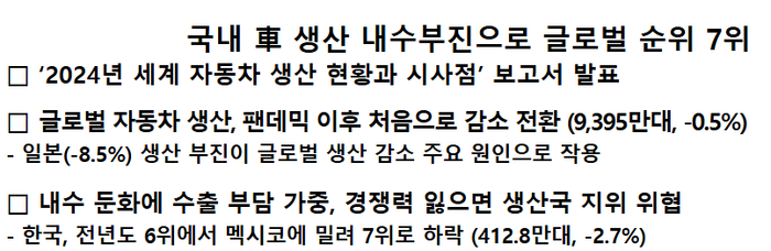 韩国汽车移动产业协会发布报告称,2024年全球汽车产量减少0.5%至9395万辆,主要原因是车企质量认证问题导致日本产量大幅下跌8.5%。同时,韩国汽车产量下滑2.7%至413万辆,排名全球第七。中美日印四国继续占据全球汽车产量前四名。