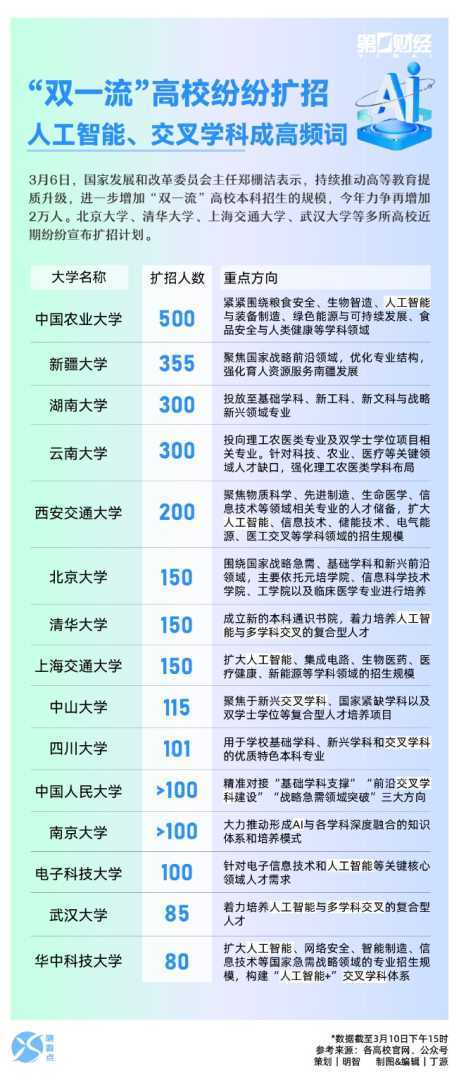 北京大学、清华大学等多所高校近期公布扩招计划,人工智能、学科交叉成为高频词汇。此次扩招旨在培养更多优秀人才,推动相关产业快速发展,打破学科壁垒,促进知识融合与创新。