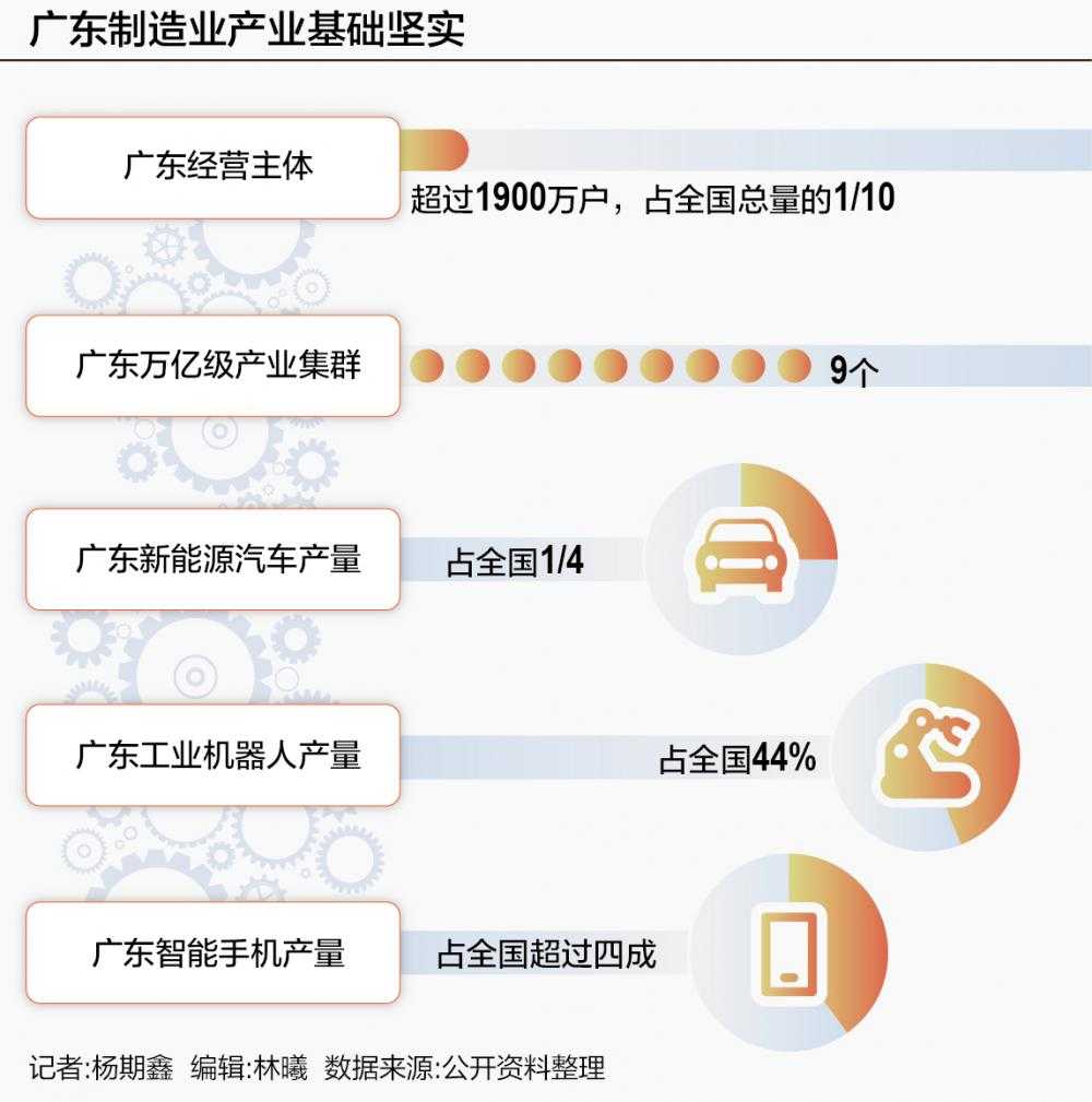 过去40余年,广东作为中国经济第一大省,以改革开放前沿的角色在中国经济发展中扮演重要角色,并以经济转型先锋的姿态闯过多个经济周期。期间,广东积淀了雄厚的制造基础、活跃的科技创新生态、完善的产业配套体系、优越的营商环境、发达的开放网络和庞大的消费市场,形成众多产业巨头,如研祥、小鹏、大疆等。截至2024年末,广东拥有超过1900万户经营主体,占全国总量的1/10;形成9个万亿级产业集群,新能源汽车产量占全国1/4、工业机器人产量占全国44%、智能手机产量占全国超过四成。