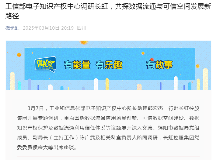 3月7日,工业和信息化部电子知识产权中心所长助理郭宏杰一行赴长虹控股集团,就数据流通应用场景创新、可信数据空间建设、数据知识产权保护等议题进行专题调研,旨在推动数据产业健康发展。