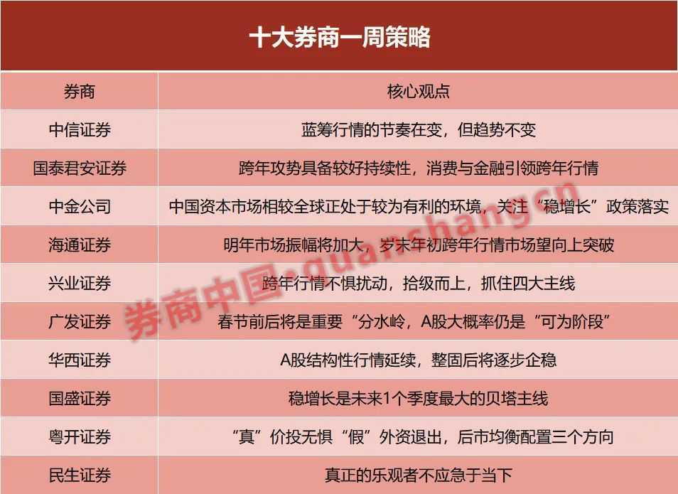 十大券商策略普遍认为,蓝筹行情趋势不变,跨年行情在节奏上具备持续性,消费与金融等板块将领衔跨年行情。同时,关注年报预喜板块、具备alpha属性的大消费龙头公司及科技股。