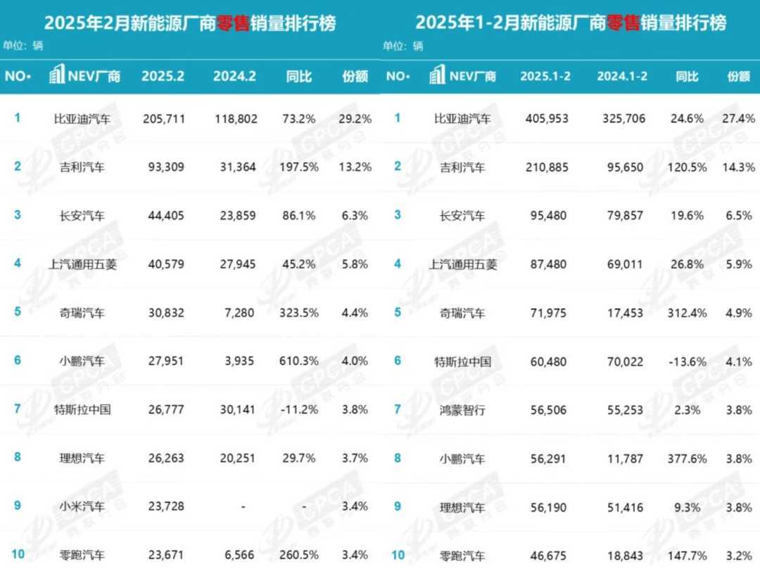 2025年2月,国内狭义乘用车市场零售销量达138.2万辆,同比增长25.6%,环比下降26.4%。1-2月累计销量317.6万辆,同比微增1.1%。得益于去年低基数,今年2月乘用车市场实现同比大幅增长,迎来“节后开门红”。