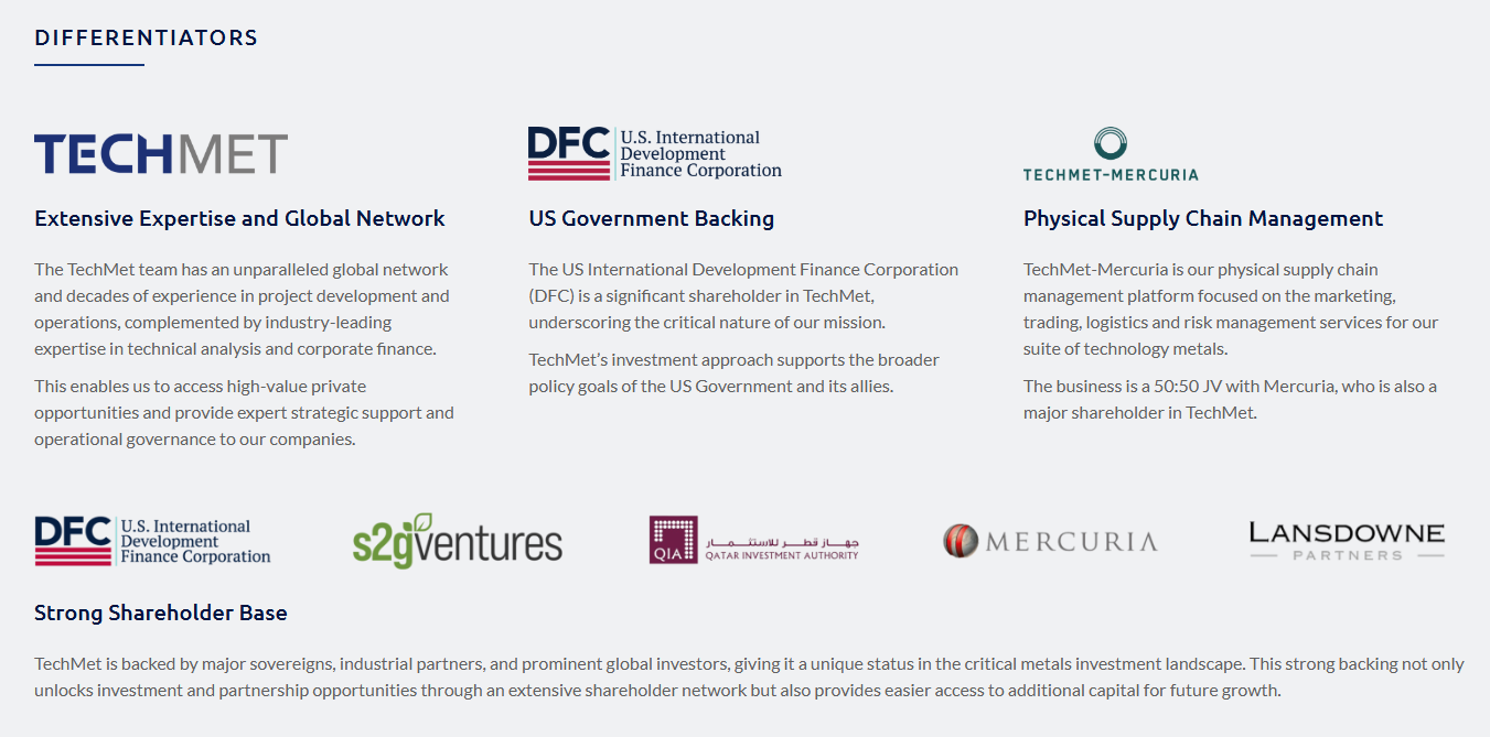 成立于2017年的TechMet,在特朗普第一任期的首年便获得了美国国际开发金融公司(DFC)2500万美元的首笔投资,这是美国政府首次直接投资金属和矿业公司。目前,TechMet估值已达12亿美元,其股东阵容豪华,包括DFC、沃尔玛创始人沃尔顿家族旗下的风险投资公司S2G Ventures、大宗商品交易商Mercuria以及英国对冲基金Lansdowne Partners等。