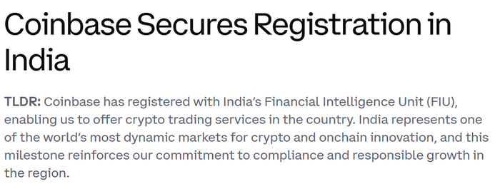 Coinbase在印度金融情报机构完成注册,标志着可在印提供加密货币交易服务。计划今年晚些时候推出初始零售服务,并进行额外投资和推出更多产品,以满足当地需求。