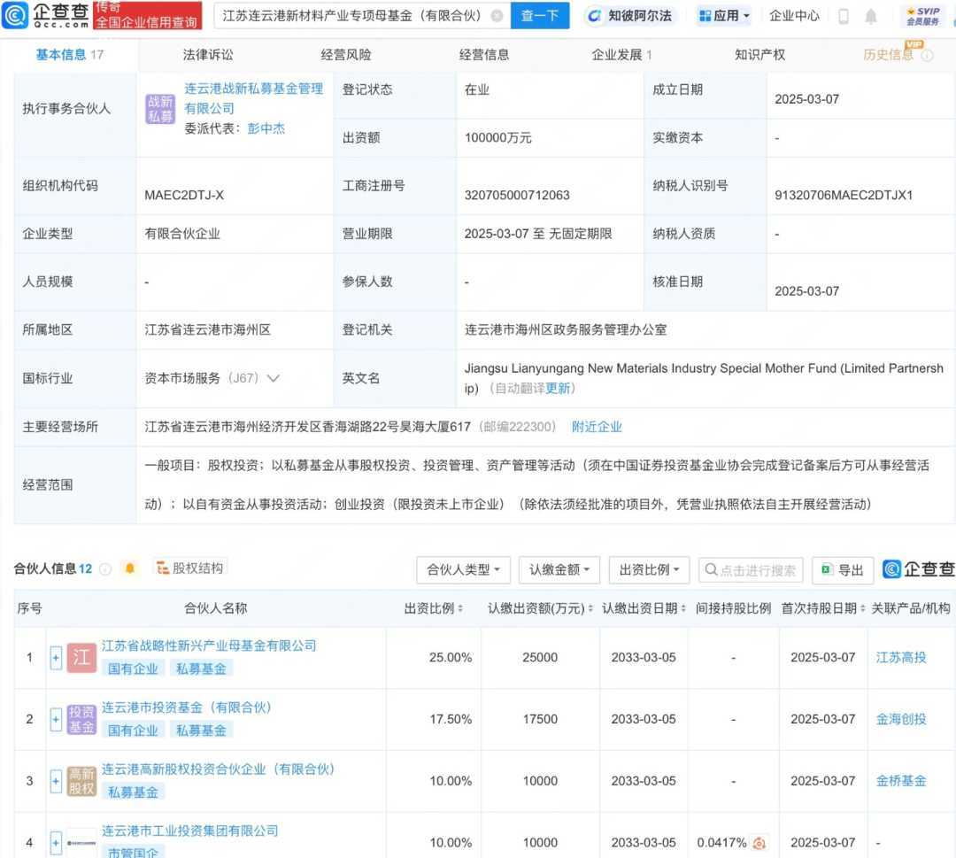 江苏连云港新材料产业专项母基金近日成立,出资额为10亿元人民币,经营范围广泛。该基金由江苏省战略性新兴产业母基金有限公司等共同出资,旨在助力新材料产业发展。