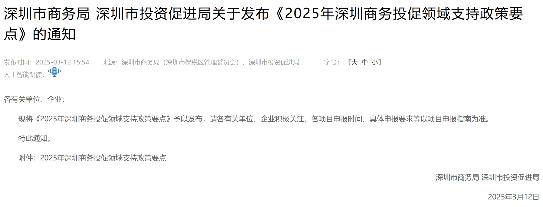 3月12日,深圳市商务局、深圳市投资促进局联合发布了《2025年深圳商务投促领域支持政策要点》。