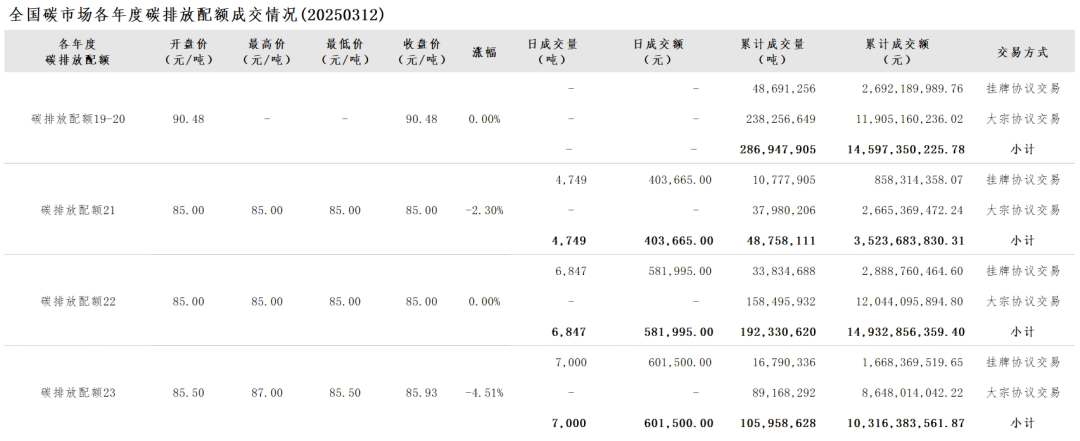 3月12日全国碳市场综合价格行情显示,开盘价87.00元/吨,收盘价86.60元/吨,较前一日下跌1.72%。当日挂牌协议交易成交量18,596吨,成交额1,587,160.00元。截至2025年3月12日,全国碳市场碳排放配额累计成交量突破633,995,264吨。
