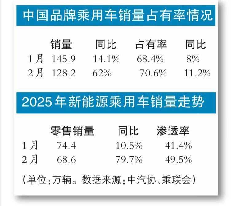 2月春节后,随着新一轮以旧换新政策扩围落地和技术升级,市场需求被激发,市场活力显著增强。值得注意的是,比亚迪、吉利、广汽、小鹏等头部车企在智能汽车领域持续创新,2月中国品牌乘用车市占率已超七成。