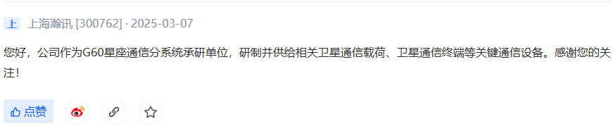 上海瀚讯作为G60星座通信分系统承研单位,研制并供给相关卫星通信设备。