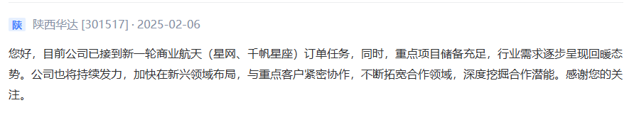陕西华达已接到新一轮商业航天订单任务,同时重点项目储备充足。