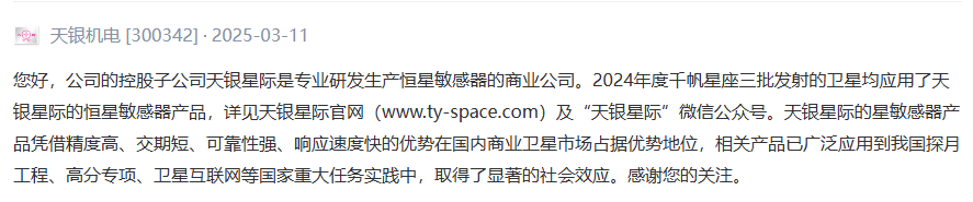 天银机电的控股子公司天银星际的恒星敏感器产品已应用于“千帆星座”三批发射的卫星。