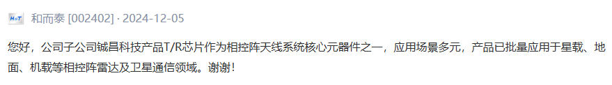 和而泰子公司铖昌科技产品T/R芯片已批量应用于星载、地面、机载等相控阵雷达及卫星通信领域。