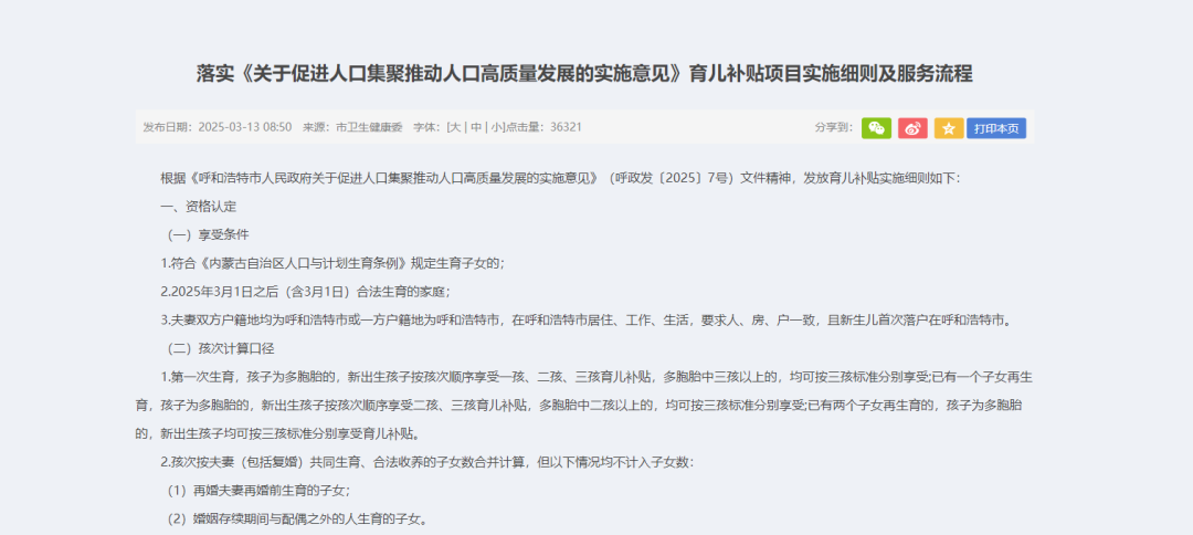3月13日,呼和浩特市卫生健康委员会(下称“呼市卫健委”)发布文件,对于今年3月1日之后(含3月1日)合法生育,且新生儿首次落户在该市的家庭,将提供高额育儿补贴。