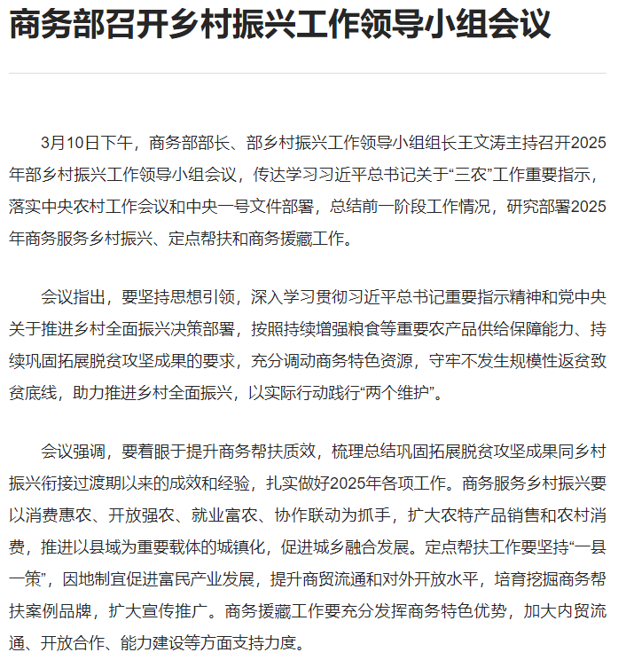 商务部近日召开会议,部署2025年商务服务乡村振兴、定点帮扶和商务援藏工作,旨在通过消费惠农、开放强农等措施推动农村经济与城乡融合发展,同时加大对内贸流通、开放合作等领域的支持力度。