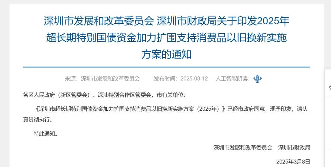 深圳市发展改革委和财政局发布《深圳市超长期特别国债资金加力扩围支持消费品以旧换新实施方案(2025年)》,旨在推动汽车、家电、数码产品等领域以旧换新,涵盖9大领域,包括汽车报废更新、家电以旧换新等,提供多项补贴政策,持续释放投资消费潜力。