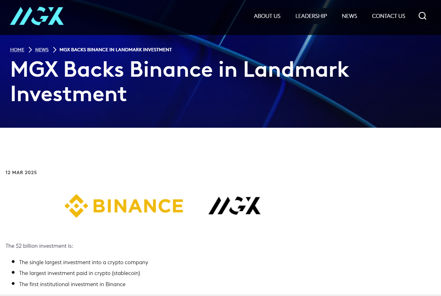 币安获20亿美元投资,MGX首次涉足加密货币