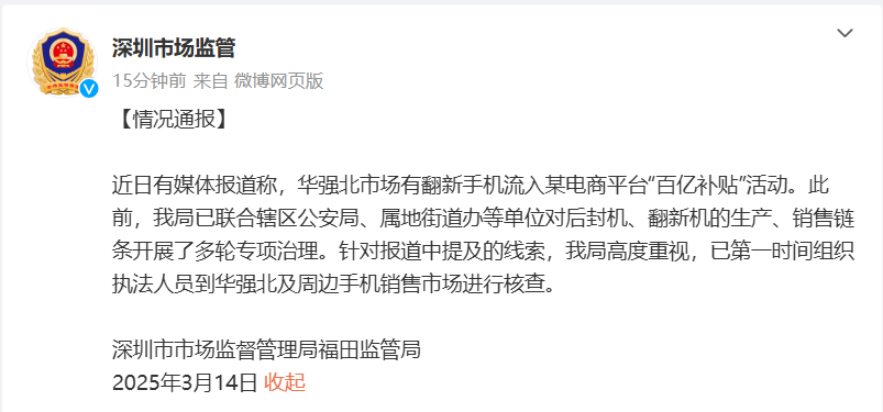 近日,有媒体报道华强北市场存在翻新手机流入某电商平台“百亿补贴”活动的情况。深圳市场监管局已迅速响应,联合多部门对后封机、翻新机的生产、销售链条展开多轮专项治理,并第一时间组织执法人员深入华强北核查。