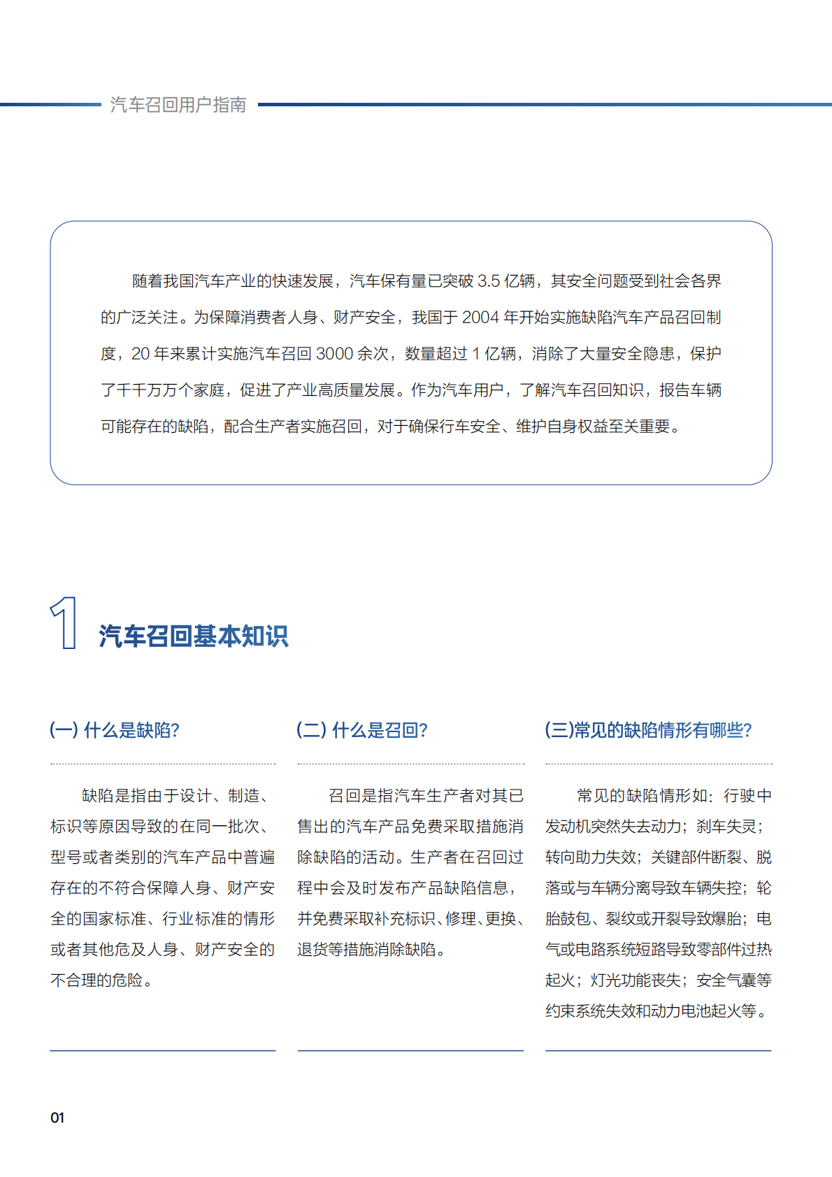 该指南从消费者角度出发,提供了全面的汽车召回指引。内容涵盖了汽车召回的基本知识、车辆缺陷线索报告的方法、车辆召回范围的查询途径、如何配合生产者进行召回维修,以及常见的召回维权问题等。通过这份指南,消费者将能够更加清晰地了解汽车召回流程,维护自身权益。