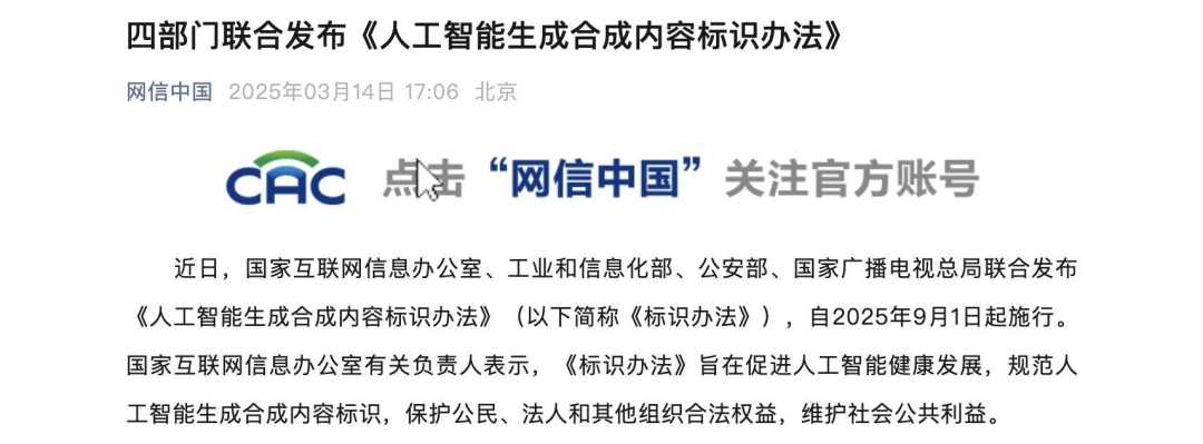 《人工智能生成合成内容标识办法》将于2025年9月施行
