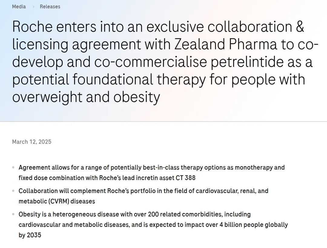 罗氏与Zealand Pharma合作开发Petrelintide,瞄准减肥市场