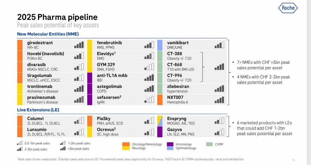 罗氏去年在研发上采取谨慎策略,终止了十条管线,但预计未来将有7个以上潜在峰值销售额超30亿瑞士法郎的新分子实体出现,包括CT-388及两款减肥药CT-996和CT-868。