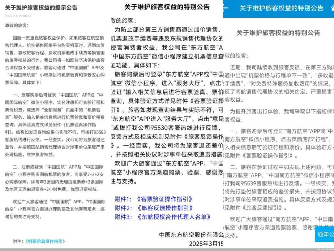 “3·15国际消费者权益日”来临之际,国航、东航、南航针对第三方航空销售平台和代理人加价销售、篡改旅客行程等违规行为,采取了严厉措施。三大航提供机票验真和票价税费查询功能,承诺查实违规行为后将退还差价并追究责任。此举旨在缓解信息不对称,规范机票代理市场。