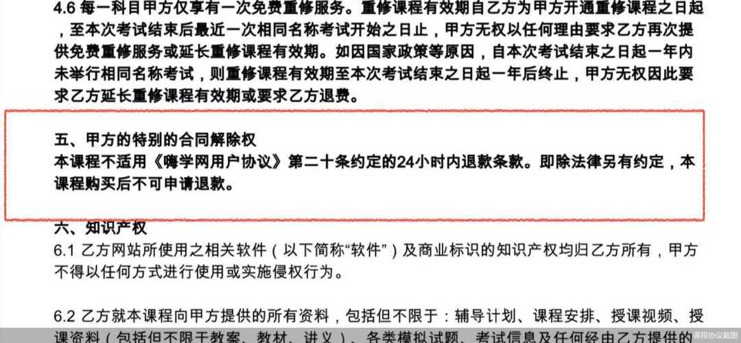同时,法律专家指出,嗨学网的课程协议中的“不可退费”条款属于霸王条款,因其未尽合理提示义务,消费者未充分知悉退费限制。且商家利用冗长合同掩盖关键条款,通过格式条款限制了消费者主要权利,明显违反公平原则。