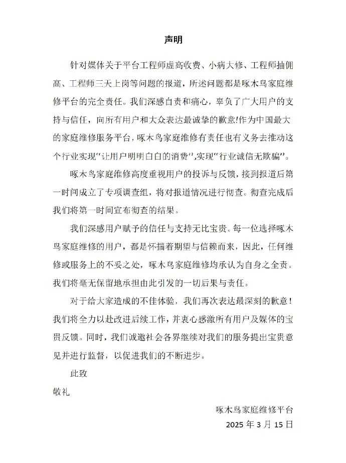 啄木鸟维修“刺客”!啄木鸟家庭维修平台被曝维修收费高昂,存在多种套路,如打开水龙头收费100元,更换成本20元的点火器收费250多元。