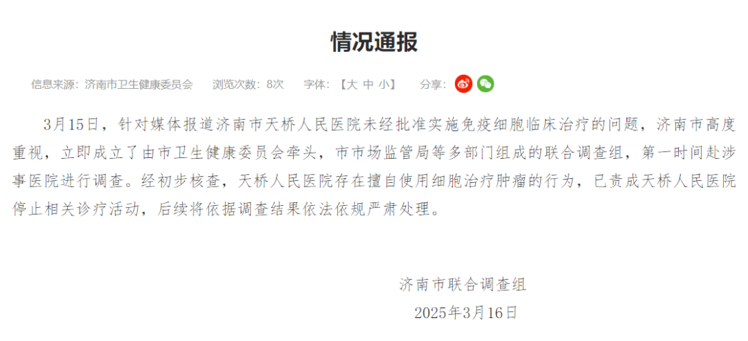3月15日,针对媒体报道济南市天桥人民医院未经批准实施免疫细胞临床治疗的问题,济南市高度重视,立即成立了由市卫生健康委员会牵头,市市场监管局等多部门组成的联合调查组,第一时间赴涉事医院进行调查。经初步核查,天桥人民医院存在擅自使用细胞治疗肿瘤的行为,已责成天桥人民医院停止相关诊疗活动,后续将依据调查结果依法依规严肃处理。