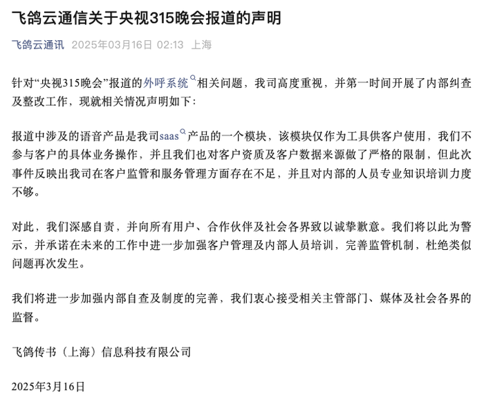 3月16日,飞鸽云通信发布声明回应“央视3·15晚会”报道,指出涉及的语音产品是其SaaS产品的一个模块,仅作为工具供客户使用,不参与客户具体业务,且对客户资质及数据来源有严格限制。但此次事件暴露了公司在客户监管和服务管理上的不足,以及内部人员专业知识培训力度欠缺。公司对此深感自责,并向所有用户、合作伙伴及社会各界致歉。