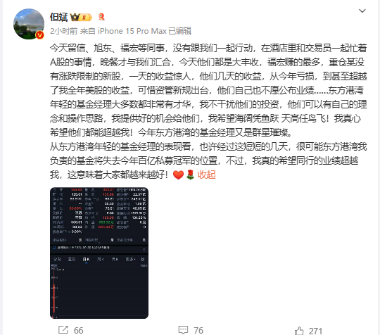但斌进一步表示,从东方港湾年轻基金经理的近期表现来看,他们展现出了强大的投资能力和市场洞察力。尽管这意味着但斌负责的基金可能因此失去今年百亿私募冠军的位置,但他对此持开放态度,并坦言:“我真的希望同行的业绩能够超越我,因为这代表着整个行业都在不断进步,大家都越来越好。”