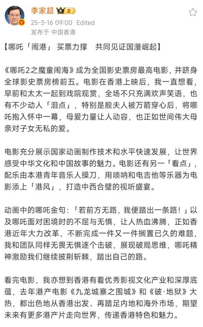 李家超还提到,电影中哪吒的金句“若前方无路,我便踏出一条路”以及哪吒面对困境的不屈精神,让他深感共鸣。他表示,这种精神与香港近年大力改革的决心相呼应,激励他们无畏无惧地逐个击破难题,展现破局思维。