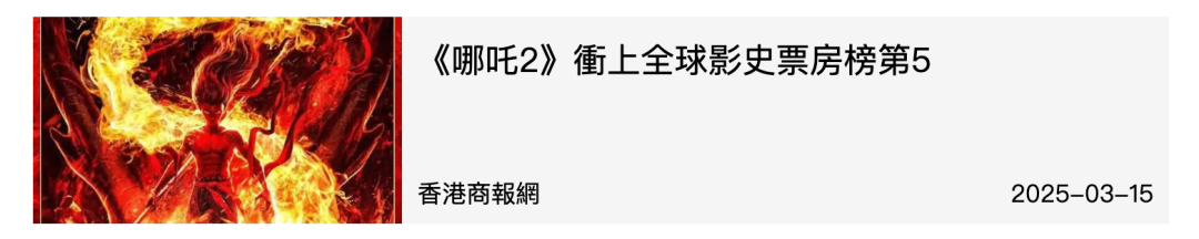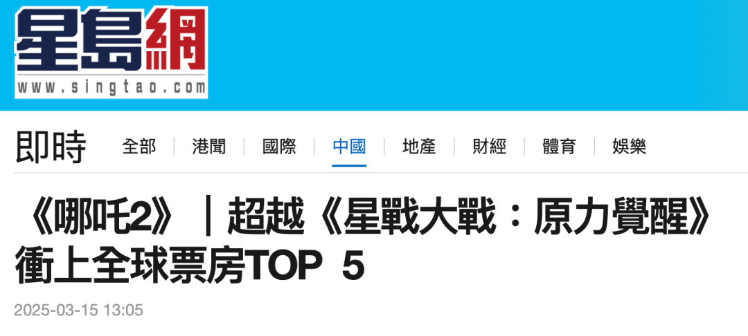 自春节上映以来,《哪吒2》不断刷新票房纪录。目前,该片的国际征程仍在继续,香港多家媒体持续关注其海外热潮。星岛日报、香港商报等多家媒体昨日一同报道了《哪吒2》力压《星球大战:原力觉醒》,登上全球票房榜前五的激动时刻。