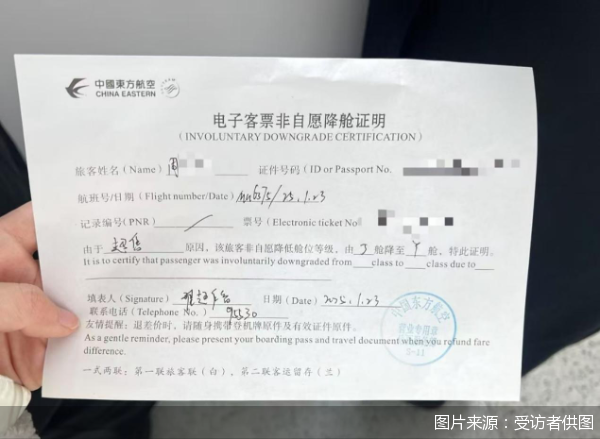 宋欣欣一家也提前约一个小时到达值机柜台。但东航只给出降舱这一解决方案及相应赔偿方案,而宋欣欣的唯一诉求是全家都坐公务舱,双方意见无法达成一致。沟通协商耗费大量时间,眼看飞机就要停止登机,宋欣欣十分焦虑。迫于无奈,最终签署了东航《非自愿降舱补偿确认书》,选择让丈夫前往经济舱。