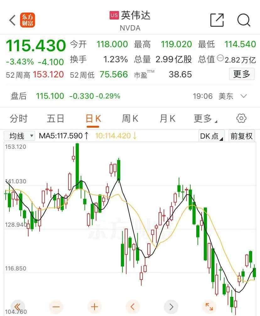 在二级市场方面,美东时间周二,英伟达(NVDA,股价:115.43美元;总市值:2.82万亿美元)下跌3.43%。今年以来,英伟达股价跌超16%,近期有所反弹。英伟达的股价现在按今年的预期收益计算,市盈率不到27倍,比去年GTC大会时低23%,甚至低于多数增速更慢的超大型科技股。
