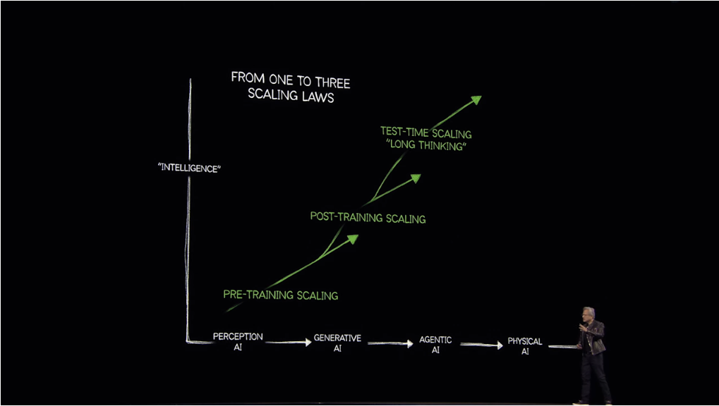 黄仁勋强调,未来必须关注训练和扩展构建的AI模型,他介绍了AI扩展定律(scaling law)的发展演化,从预训练扩展、训练后扩展到测试时间扩展,即“长思维”。英伟达周二发布针对开发者和企业的开源AI模型系列,帮助他们打造Agentic AI平台。