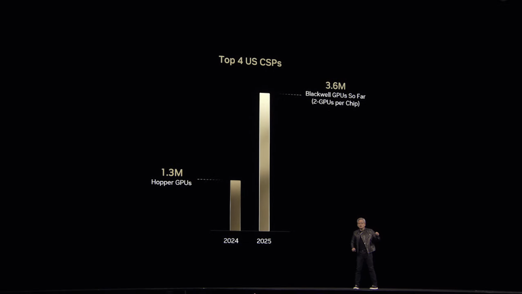 黄仁勋表示,Blackwell芯片推出一年来,AI行业取得了巨大进展。2024年全球前四云服务提供商共采购130万片Hopper架构芯片,2025年又购买了360万Blackwell芯片。预计到2028年数据中心建设支出将达1万亿美元。