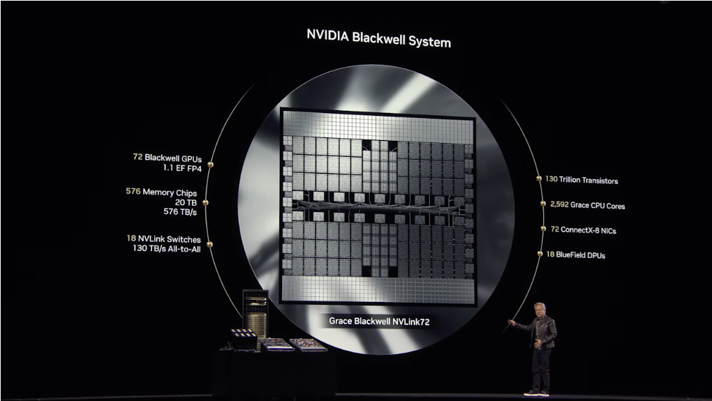 黄仁勋称,Blackwell架构芯片已全面投产,客户需求旺盛。他展示了超级芯片Grace Blackwell NVLink 72,其计算性能卓越。