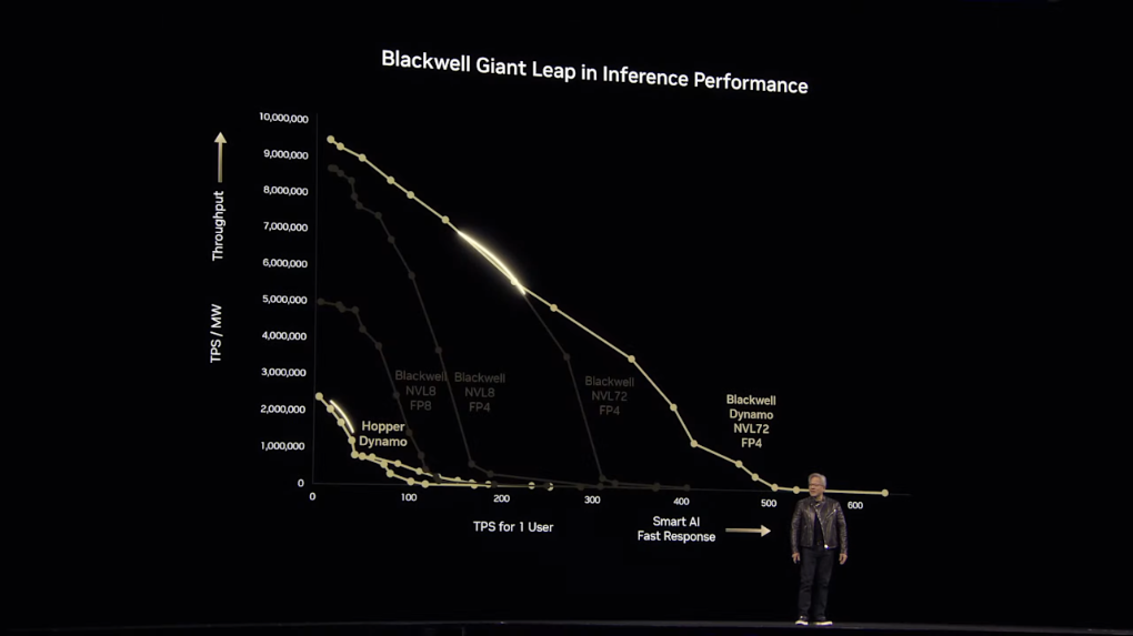 Blackwell架构相比Hopper架构性能大幅提升。黄仁勋开玩笑说,有了Blackwell等最新技术加持,搭建AI工厂的厂商买得越多省得越多。