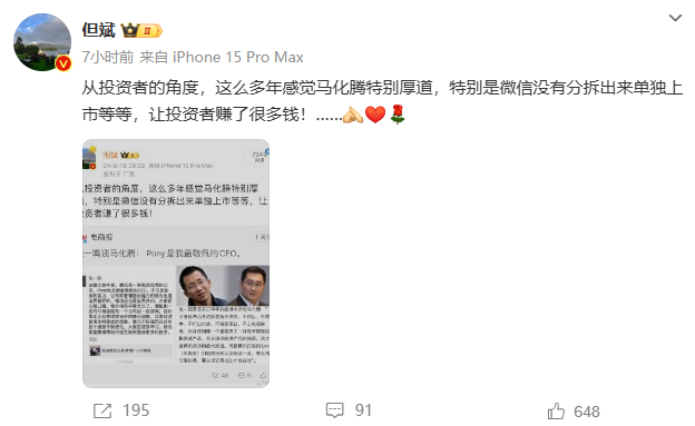 深圳东方港湾董事长但斌称赞马化腾厚道,特别指出微信未分拆上市的决定让投资者获益颇丰,引发市场关注和讨论。