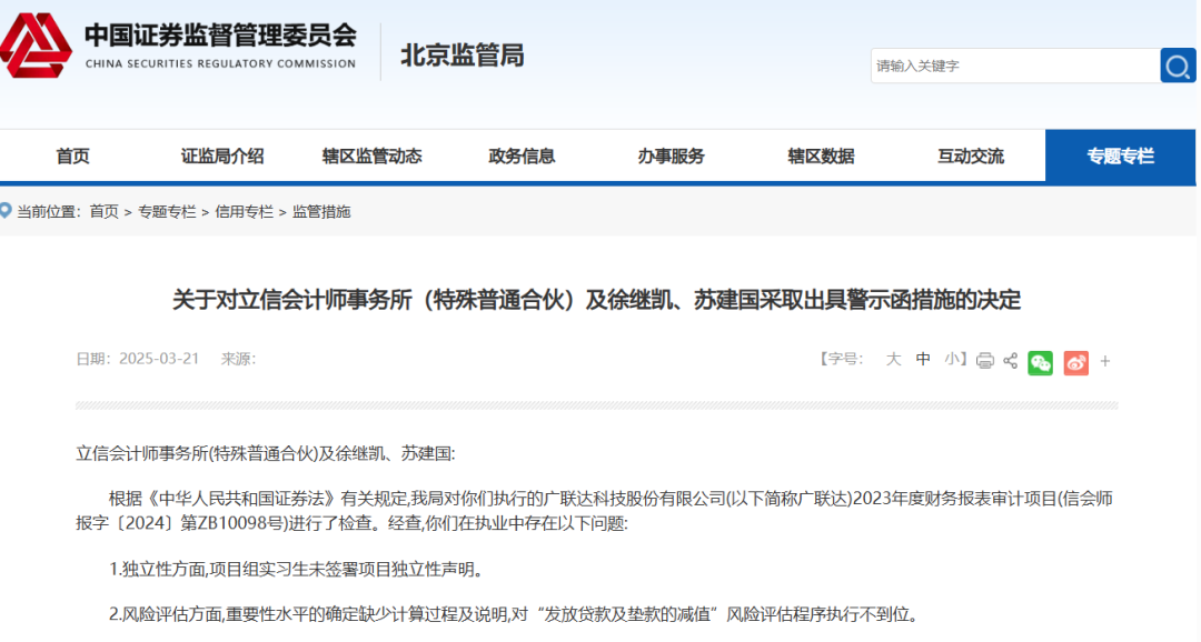 北京证监局强调,立信所及相关人员应关注执业风险,及时采取措施加强质量管理,确保执业质量。