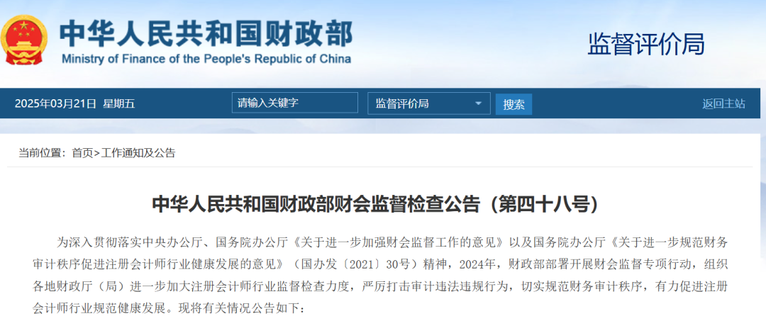 3月21日,财政部发布财会监督检查公告,显示2024年财政部部署开展财会监督专项行动,对2362家会计师事务所开展检查,覆盖面超过全国会计师事务所总量的20%。全年共对231家会计师事务所、514名注册会计师作出行政处罚。